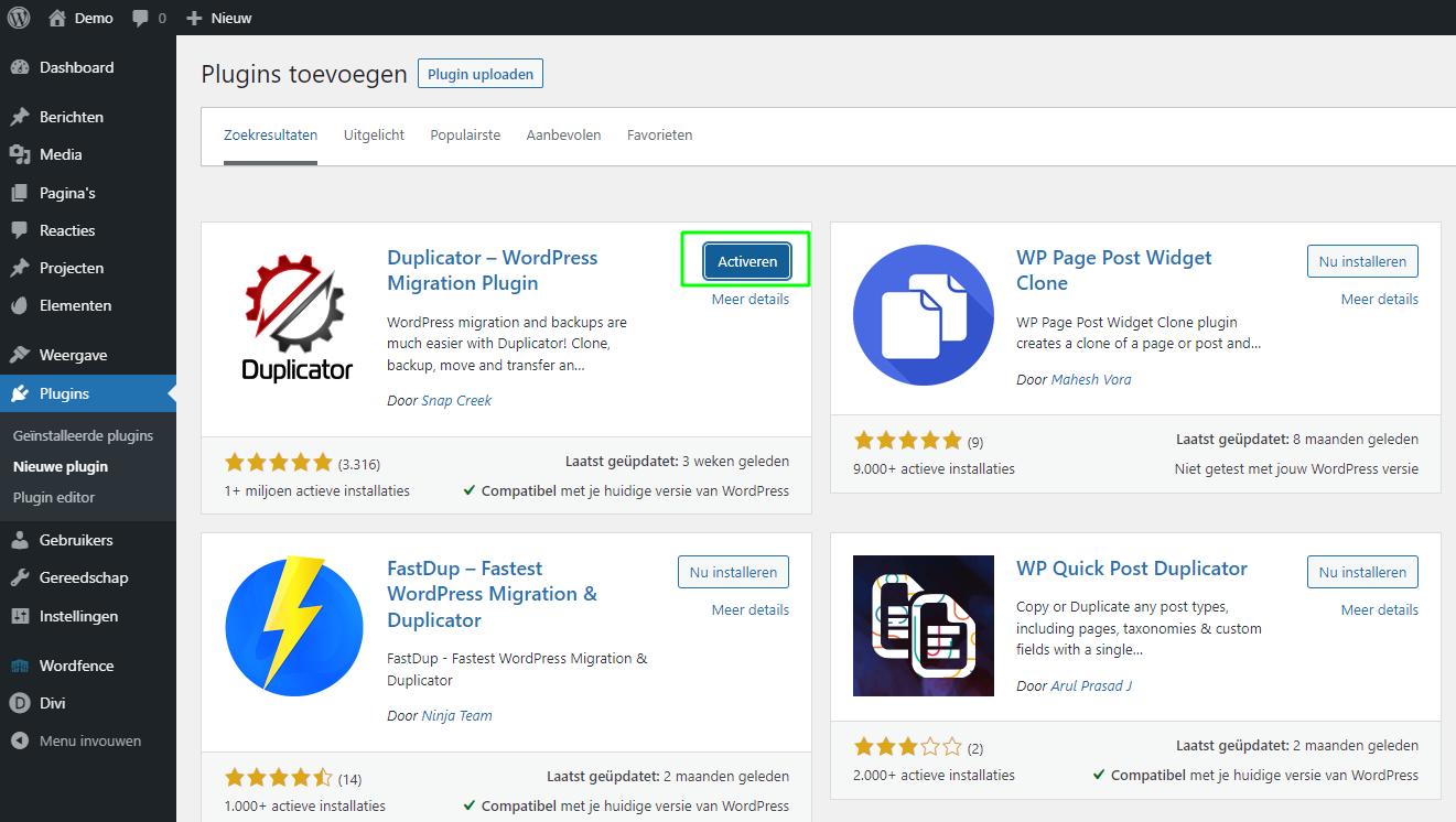Als je dit voor de eerste keer doet, dan moet je eenmalige de Duplicator plugin installeren en activeren. Heb je de Duplicator plugin al geïnstalleerd dan kan je deze stappen overslaan.